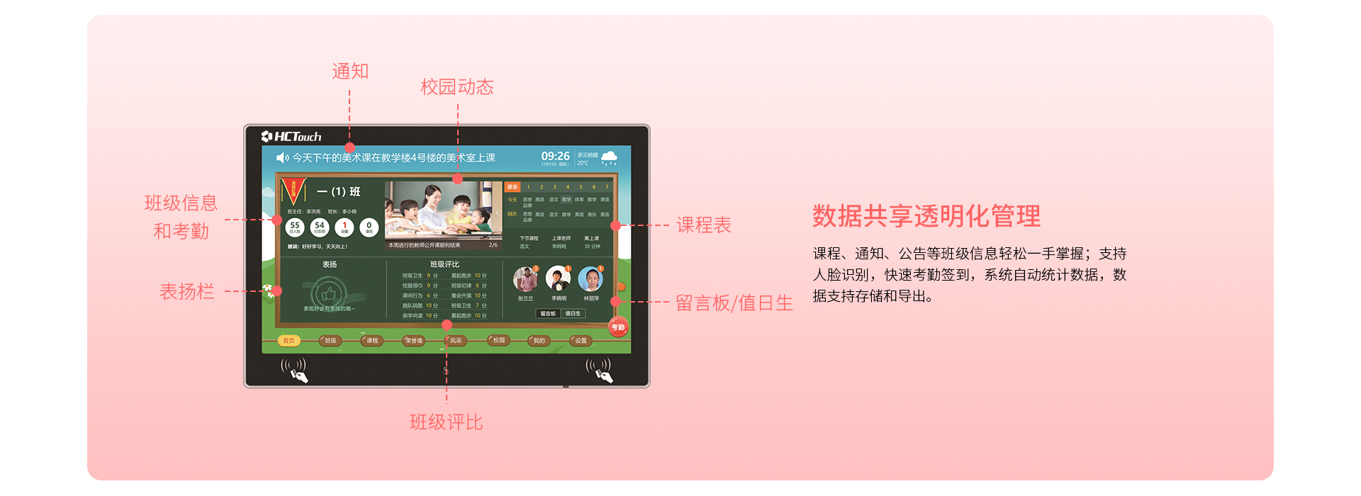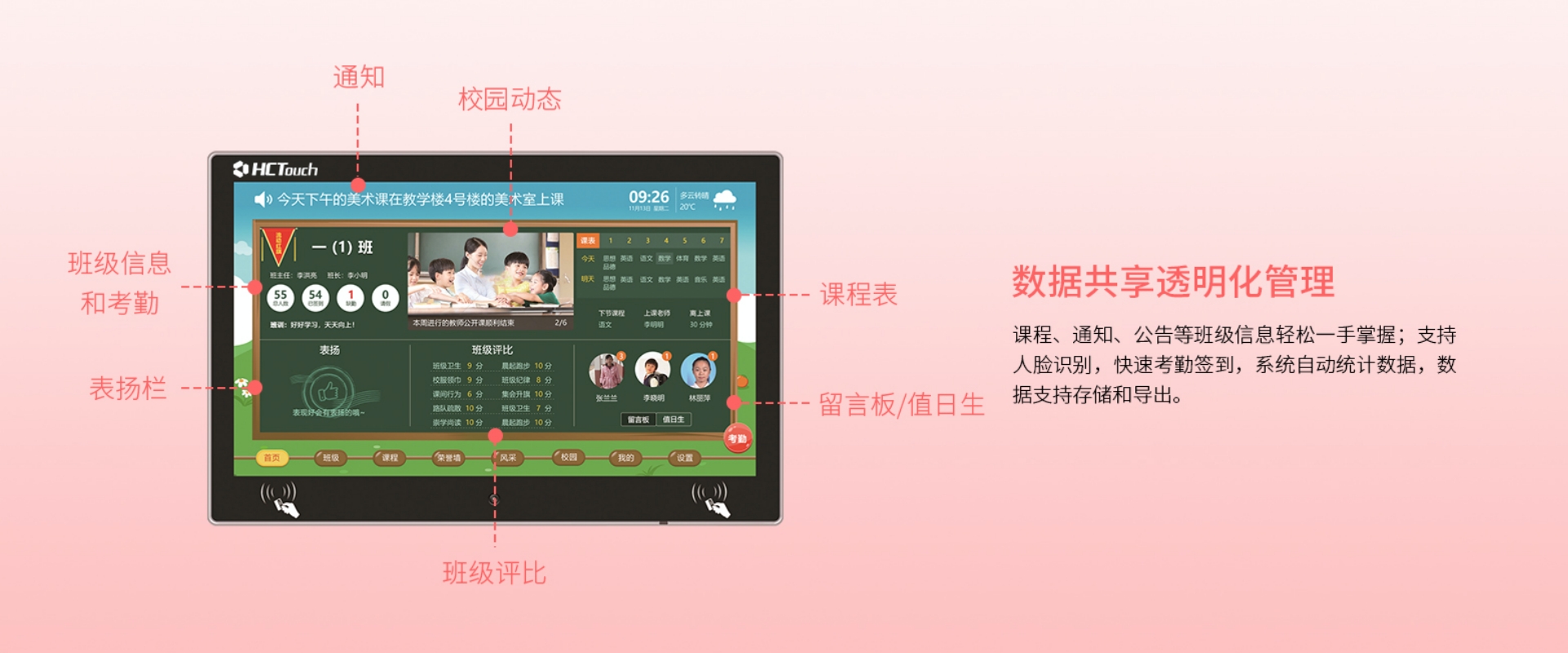 华创智航智慧班牌是一款智能交互终端,可满足校园信息发布、班级活动展示、课堂教学反馈等应用场景。